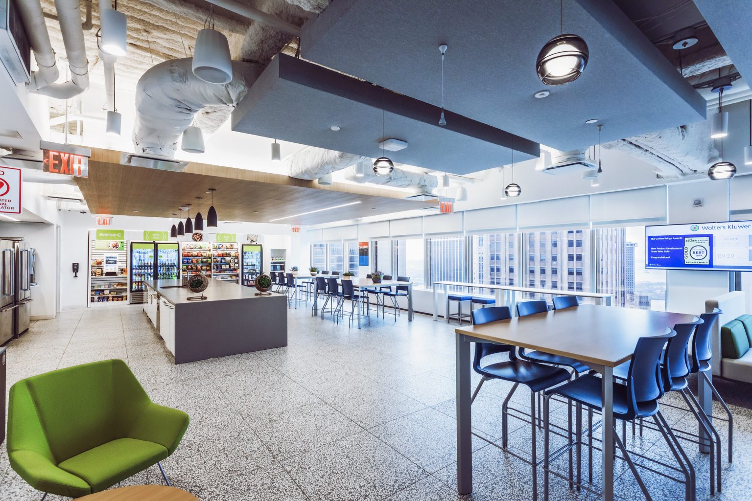 It’s important to include gathering spaces in the layout. These spaces benefit from comfortable chairs and tables with a relaxed decor. High-top tables with stools add a trendy, modern feel to a cafeteria. Comfy, padded chairs and smaller tables invite casual communication between workmates. Neutral lighting adds to a calming space and helps to promote reduced stress levels.